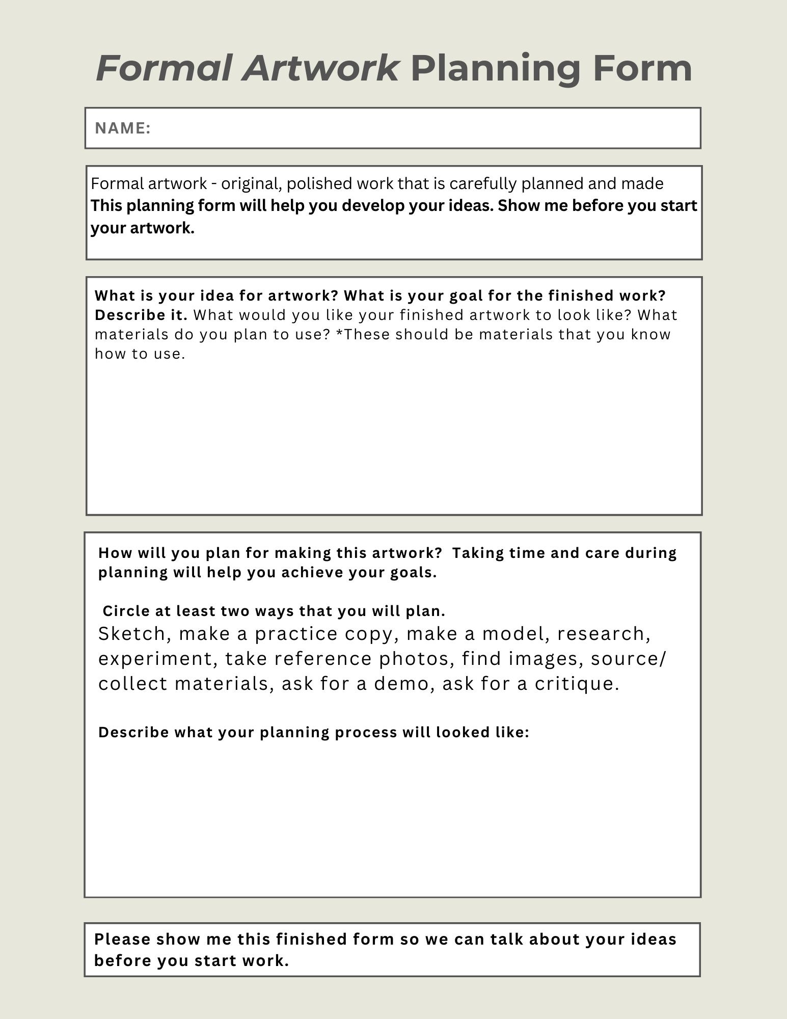 This year, to help students navigate deciding what their own art-making process needs to look like, I will have them fill out my Formal Artwork planning form (read more about the four types of work I offer in my Studio class here). I will give the class 15 minutes to fill out the form, then, instead of sharing their ideas with me, I’ll ask them to share with someone sitting near them.