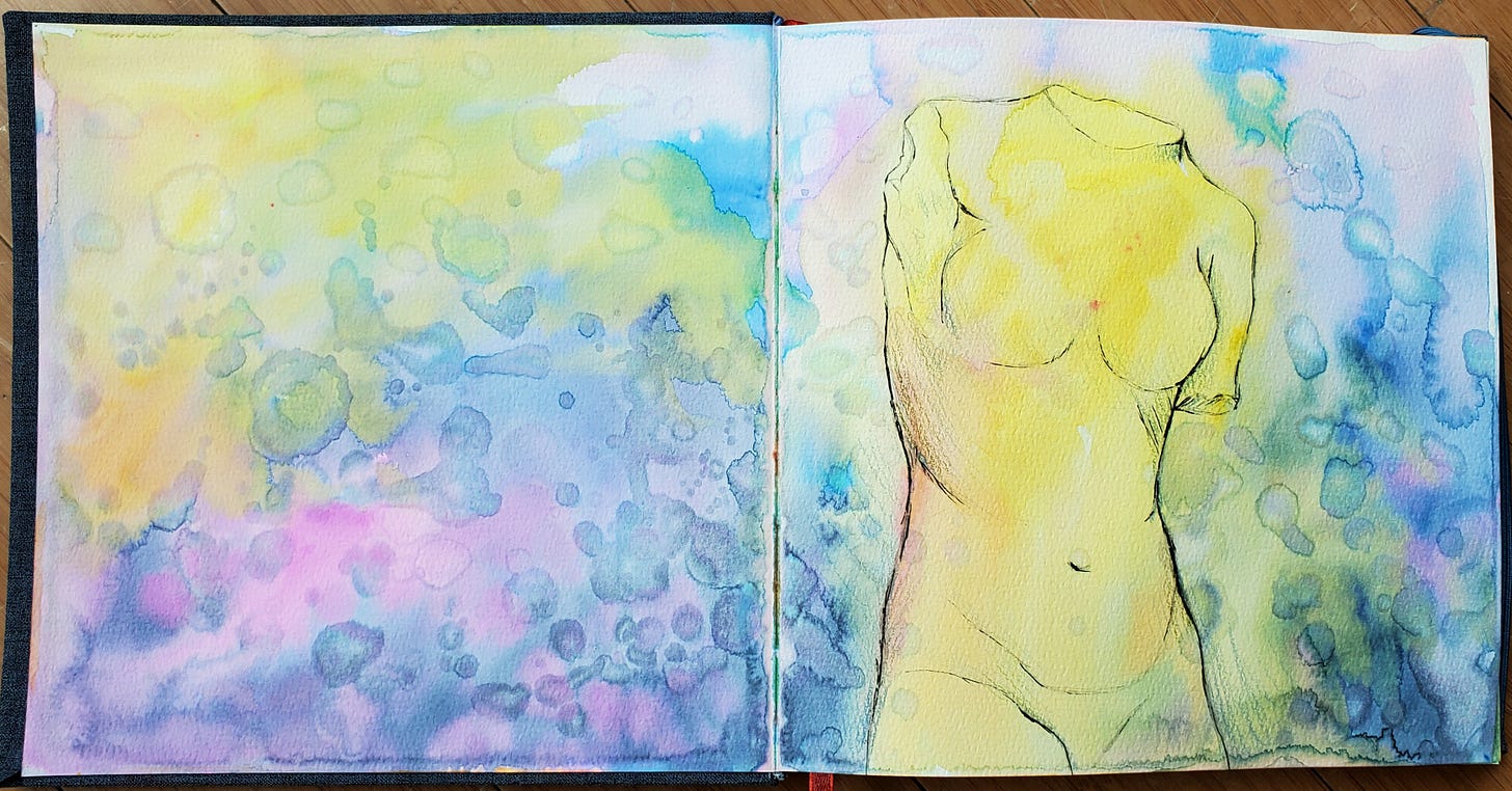 I stopped by the studio the first night with the intent to just check it out. It was full of people working and stocked with beautiful materials. I saw some liquid watercolors on a table in the wet room that called to me, sat down, and picked up a brush (it was right there, how could I resist?). I came back every night and created.