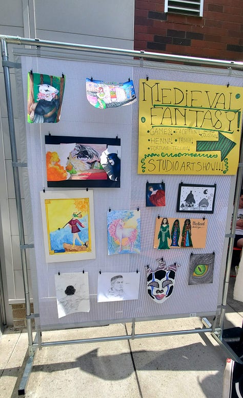We start planning by selecting a theme. I have students propose and present ideas to the class, then we vote. This year “Medieval Fantasy” was chosen. From there, each student submits artwork related to the theme and participates in planning and running an activity the day of the show.